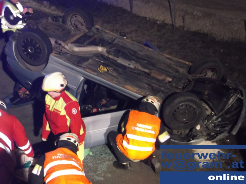 Zu einem FahrzeugÜberschlag mit vermutlicher Menschenrettung auf der Kremser Schnellstraße wurde die Feuerwehr St.Pölten-Wagram freitagabends, kurz vor der wöchentlich stattfindenden JugendÜbung, gerufen. Ungefähr 800 Meter nach der Autobahnauffahrt St.Pölten-Ost, Fahrtrichtung A1 kam es aus unbekannter Ursache zu einem Verkehrsunfall – das Unfallfahrzeug blieb am Pannenstreifen am Dach liegen. Die Bereichsalarmzentrale "Florian St.Pölten" alarmierte aufgrund der Meldung "Auto auf Dach" weiters die FF St.Pölten-Stadt mit dem Vorausfahrzeug sowie Rettungsdienst und Exekutive.