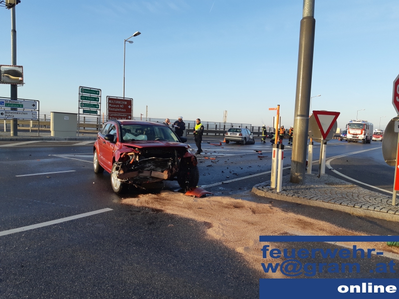 Zwei verletzte Personen hat der Zusammenstoß zweier Autos am Morgen des Dreikönigstages 2020 gebracht. Auf der BrÜcke Über die Kremser Schnellstraße waren im ampelgeregelten Kreuzungsbereich zwei Fahrzeuge kollidiert, erste Meldungen sprachen von einer eingeklemmten Person, weshalb neben der FF St. Pölten-Wagram gemäß definiertem Alarmplan auch die FF St. Pölten-Stadt alarmiert wurde.