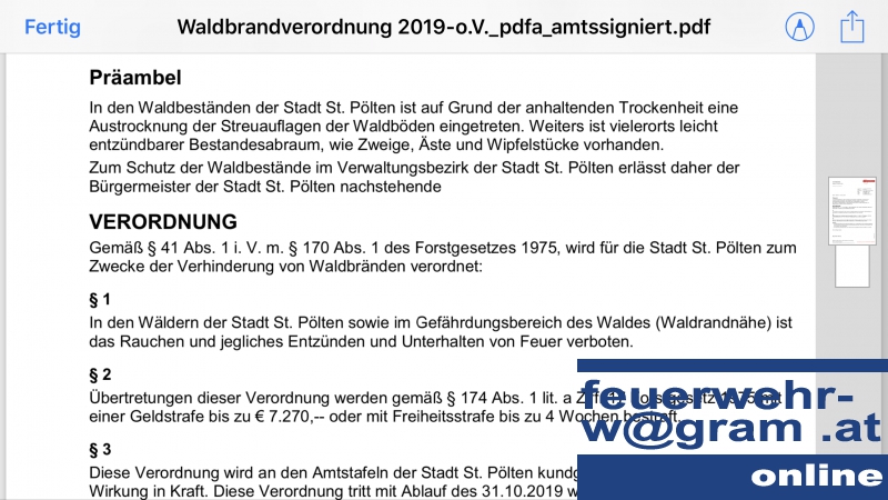 Nunmehr wurde auch fÜr die Landeshauptstadt St. Pölten ein Waldbrand – Verordnung 2019 erlassen (fÜr den Bezirk St. Pölten) besteht diese bereits seit einigen Tagen. Die FF St. Pölten-Wagram bittet um Beachtung!