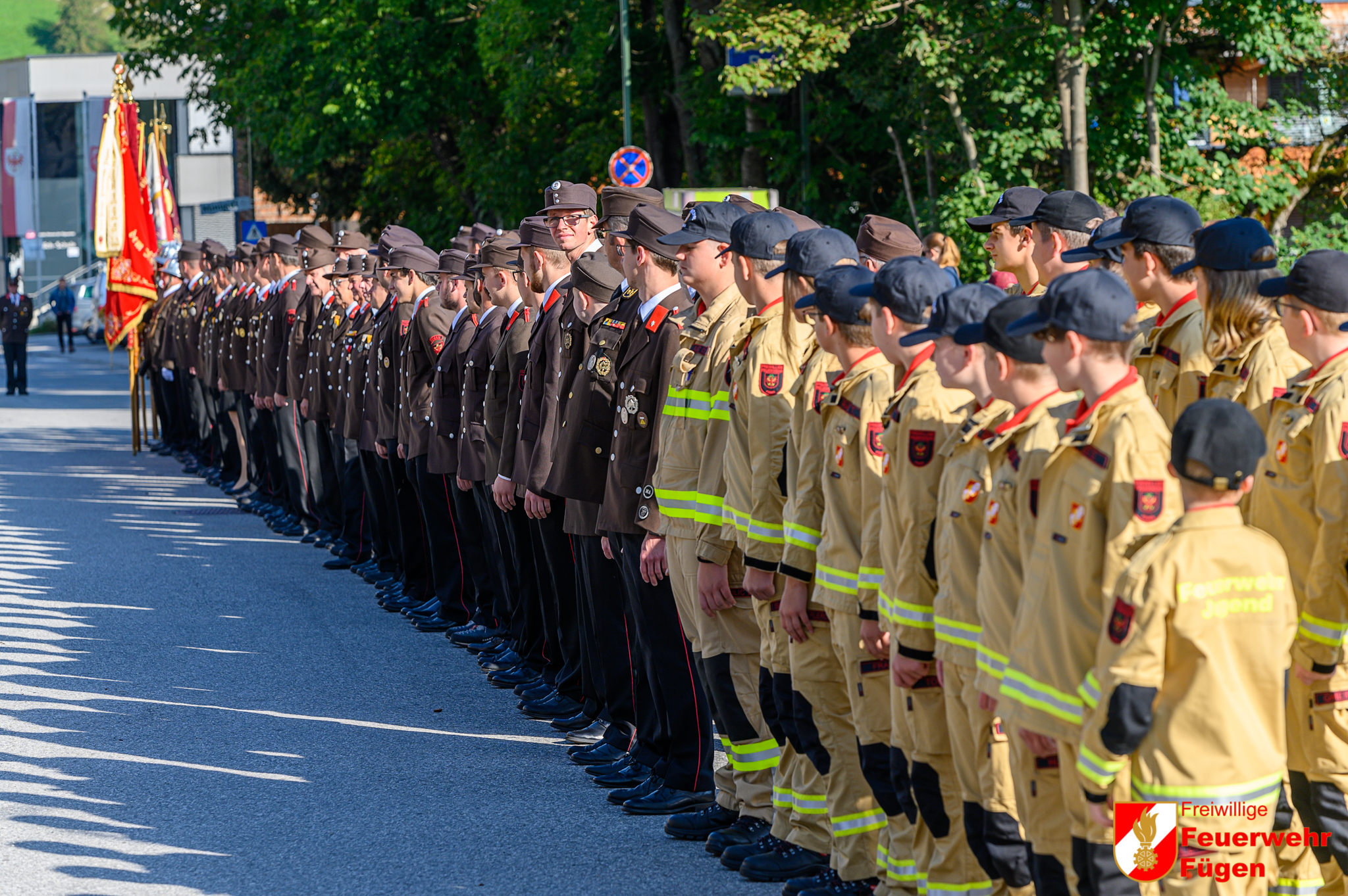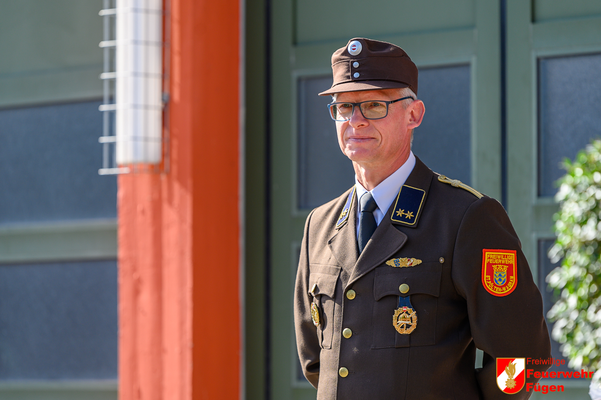 Den Abschluss des offiziellen Teils bildeten Reden der Ehrengäste sowie eine eindrucksvolle Defilierung am Dorfplatz mit allen teilnehmenden Feuerwehrmitgliedern und dem Fuhrpark der Feuerwehr Fügen.