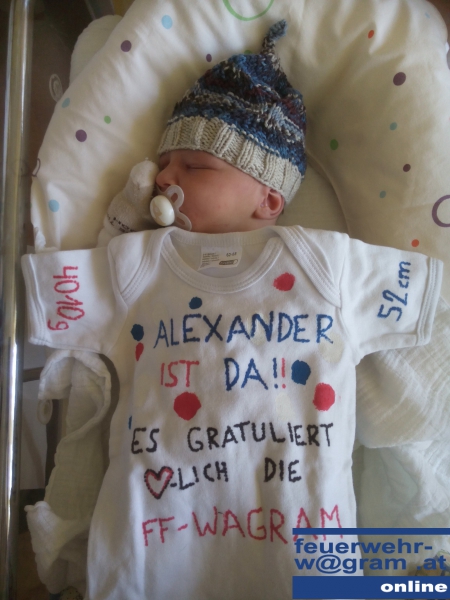 Seit Montag, 16. März 2015, ist Zugskommandant Markus Steininger stolzer Papa. "Hallo, ich bin Alexander und habe am 16.3. um 10:54 Uhr das Licht der Welt erblickt. Ab sofort werde ich das Leben von Betti und Steini auf den Kopf stellen :-)", waren die "ersten Worte" in der FF-What’s App Gruppe.