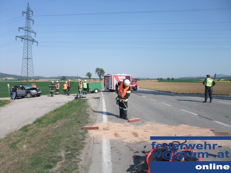 Zu einer Motorrad-Bergung nach einem Verkehrsunfall wurden die freiwilligen Helfer aus Wagram am Karsamstag gerufen: Auf der Straße Richtung Mechters war ein Motorrad-Fahrer frontal in einen PKW gekracht.