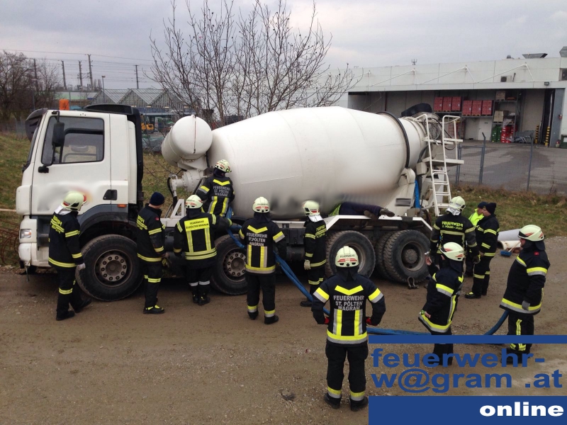 Die Kerntangente Nord durch die Landeshauptstadt wird direkt beim Zuhause der Freiwilligen Feuerwehr St.Pölten-Wagram in die bestehende Bundesstraße 1 einmÜnden. Derzeit laufen die Betonierungsarbeiten am Sockel der BrÜckensteher. Im regen Pendelverkehr der Betonmischer kam am Dienstagnachmittag ein 4-Achs-Mischer von der Baustellenzufahrt ab und drohte umzustÜrzen. Der Dieseltank war zudem auf einem massiven Schacht aufgesessen und "stabilisierte" das Schwerfahrzeug in seiner misslichen Lage.