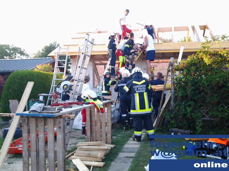 „Person in Notlage – Bewusstlose Person auf Dach“, so lautete das Einsatzstichwort fÜr die Feuerwehren St. Pölten-Wagram und St. Pölten-Stadt am Dienstagabend. Vermutlich machten die hohen Temperaturen einem Bewohner in einer Wagramer Siedlung zu schaffen – er war schon den ganzen Tag mit Dachdeckarbeiten beschäftigt. Von der Rettungsleitstelle 144 Notruf Niederösterreich wurde ein Rettungstransportwagen und das Notarzteinsatzfahrzeug St. Pölten, von der Bereichsalarmzentrale „Florian St. Pölten“ die beiden Feuerwehren alarmiert.