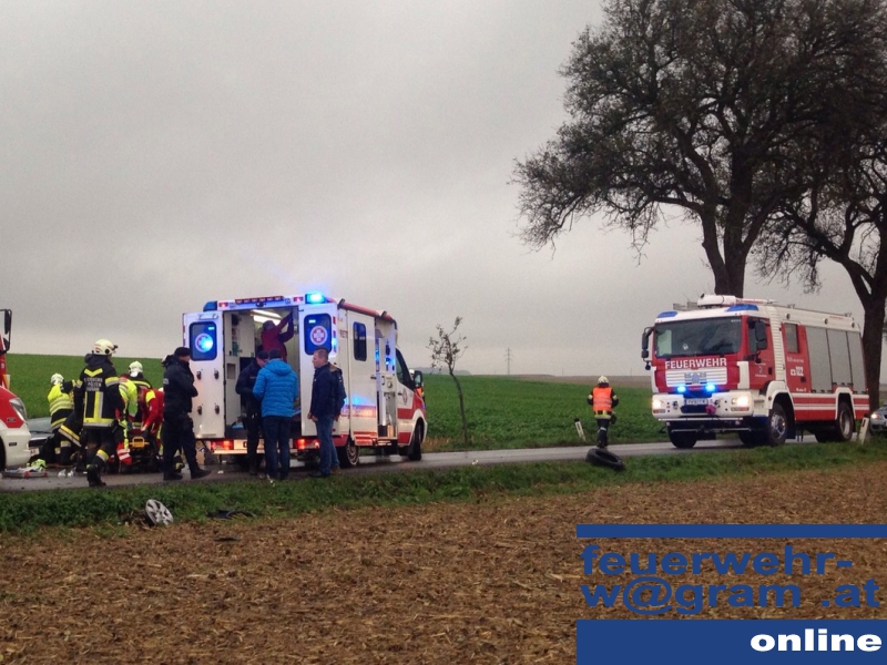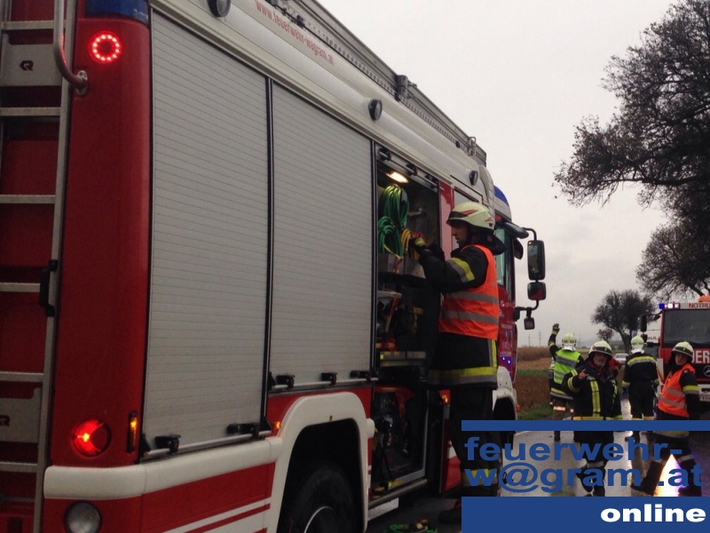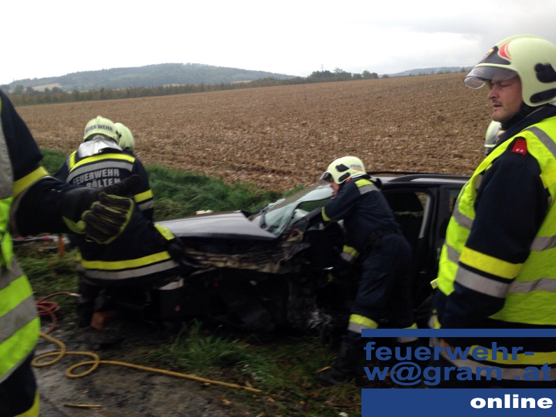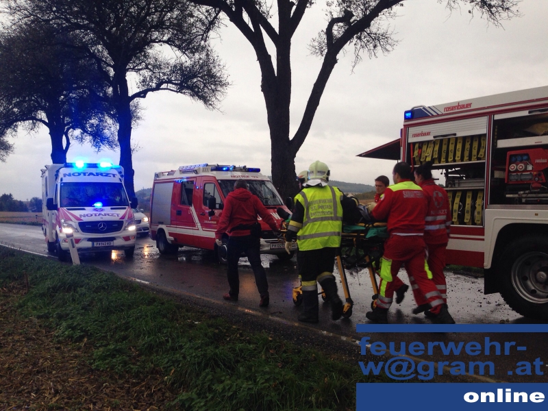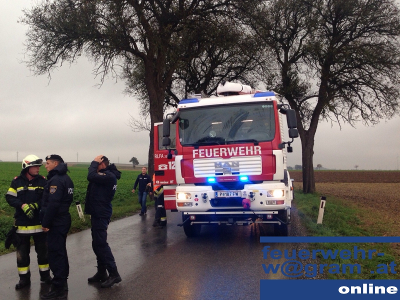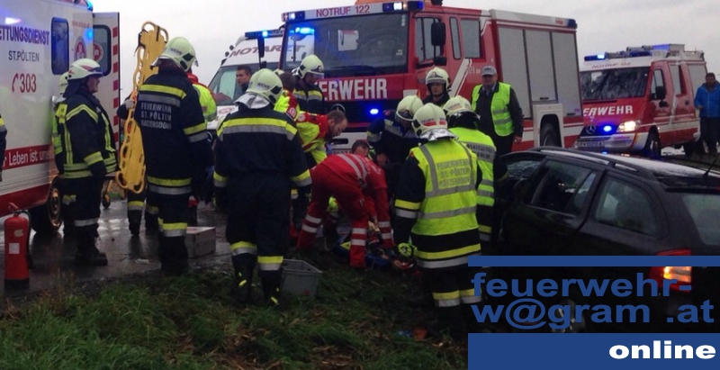 Schrecklicher Unfall am späten Nachmittag des 15. Oktober in der Nö Landeshauptstadt: Nachdem ein PKW auf regennasser Fahrbahn von der Fahrbahn abgekommen und gegen einen Baum geprallt war, wurde ein Fahrzeuginsasse unter dem linken Vorderteil des Fahrzeuges eingeklemmt. Die freiwilligen Feuerwehren St. Pölten-Ratzersdorf und St. Pölten-Wagram wurden zur Rettung der eingeklemmten Person auf die Zwischenbrunner Straße alarmiert.