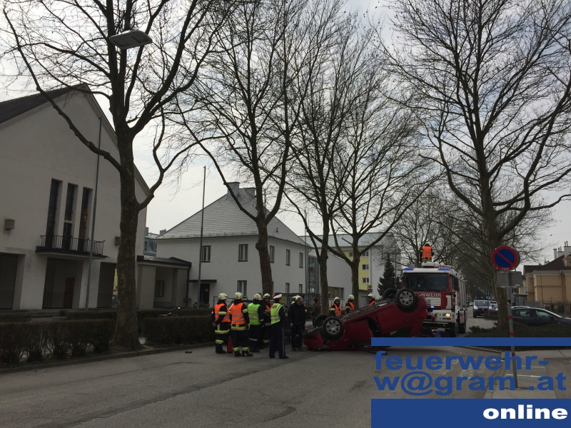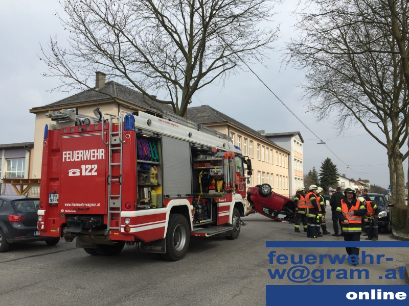 Kurz nachdem am Samstag zur Mittagszeit die wöchentliche Sirenenprobe verstummte und wieder Ruhe Über Wagram einkehrte, schrillten die Pager der Wagramer Feuerwehr und riefen zu einem Einsatz. In der Unterwagramerstraße, zwischen Schule und Kirche, war ein PKW mit einem weiteren Fahrzeug zusammengestoßen und kam auf dem Dach zu liegen. Wenige Augenblicke später rÜckten [url=http://www.feuerwehr-wagram.at/ausruestung_fuhrpark/&id=1001]RÜstlösch Wagram[/url] und [url=http://www.feuerwehr-wagram.at/ausruestung_fuhrpark/&id=1002]Tank 1 Wagram[/url], inklusive der [Url=http://www.feuerwehr-wagram.at/ausruestung_fuhrpark/&id=1009]Abschleppachse[/url], zum Unfallsort aus.